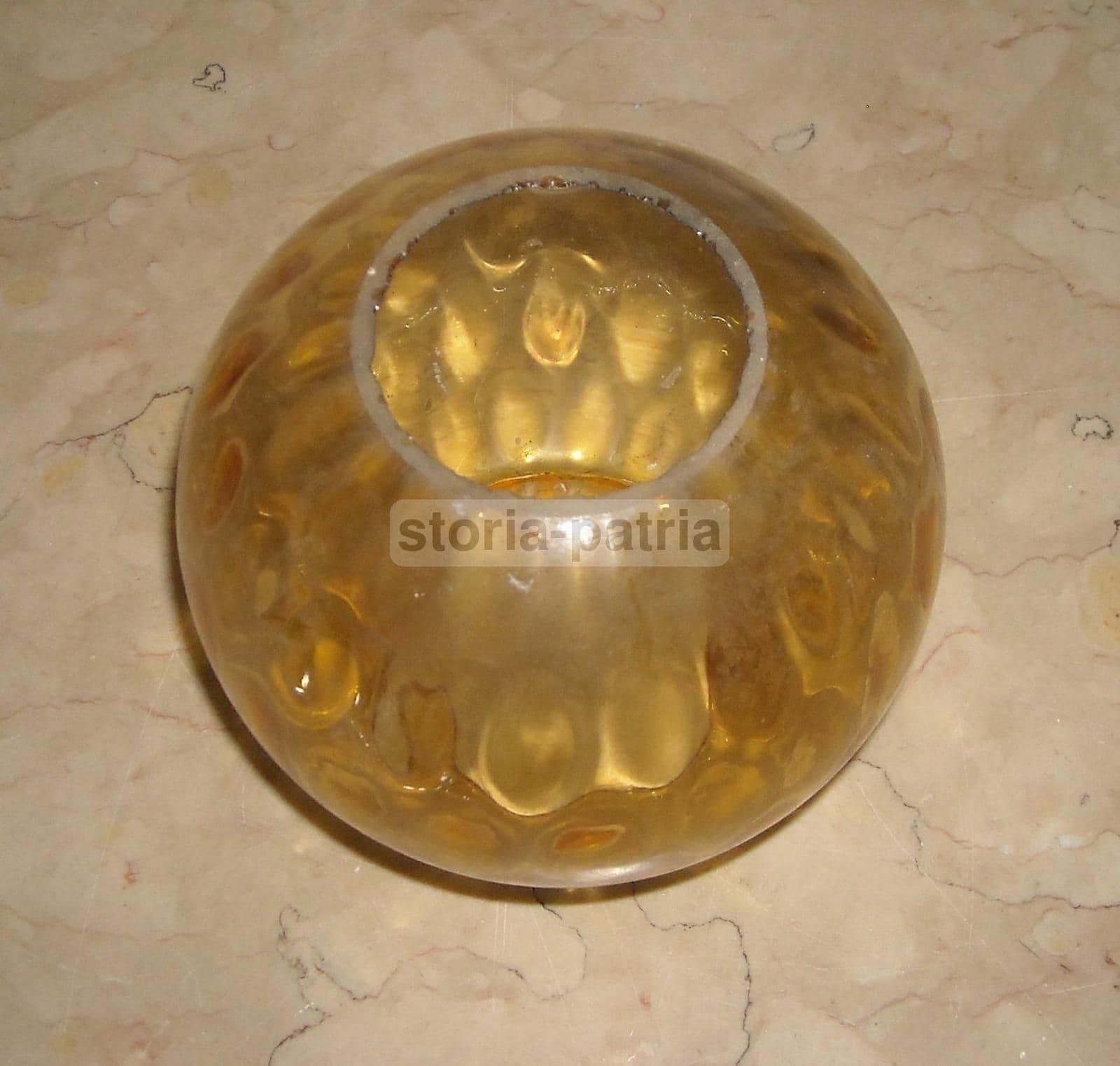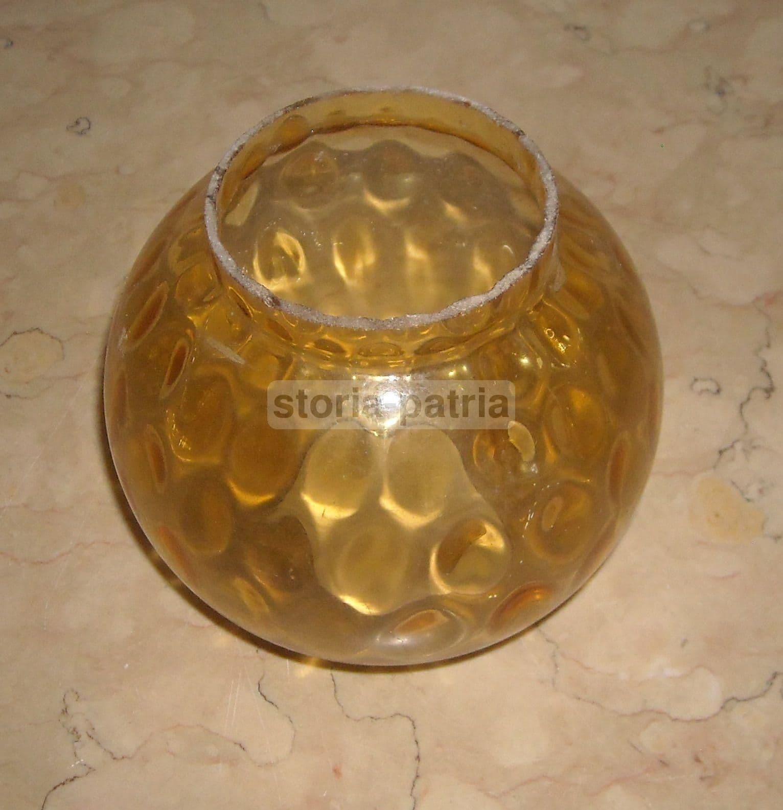Coppa per lampada Interessante vecchia coppa per lampada, in origine probabilmente utilizzata per lampada da tavolo o lampadario o applique, *di forma globulare, vetro suggestivamente colorato in giallo;* misura circa cm.11 (altezza totale), circa cm. 12 l'ampiezza, circa cm. 5 il diametro della apertura superiore, circa cm.6 il diametro dell'apertura inferiore (apertura utile a fissare la coppa ad un supporto per lampada); in vetro trasparente con bella colorazione in una tonalità di giallo-ambra; vetro databile presumibilmente alla prima metà del '900 (anni '20-'30 ?) Utile e decorativa Buona conservazione generale, segni e difetti d'uso e d'epoca, usuali sparse abrasioni o segni di usura e tracce di sporco e difetti vari marginali e così come visibili nelle immagini allegate; coppa meritevole di pulitura o lucidatura. *(le immagini allegate raffigurano alcuni particolari dell'intero oggetto, eventuali ulteriori informazioni a richiesta)* *(c67)*