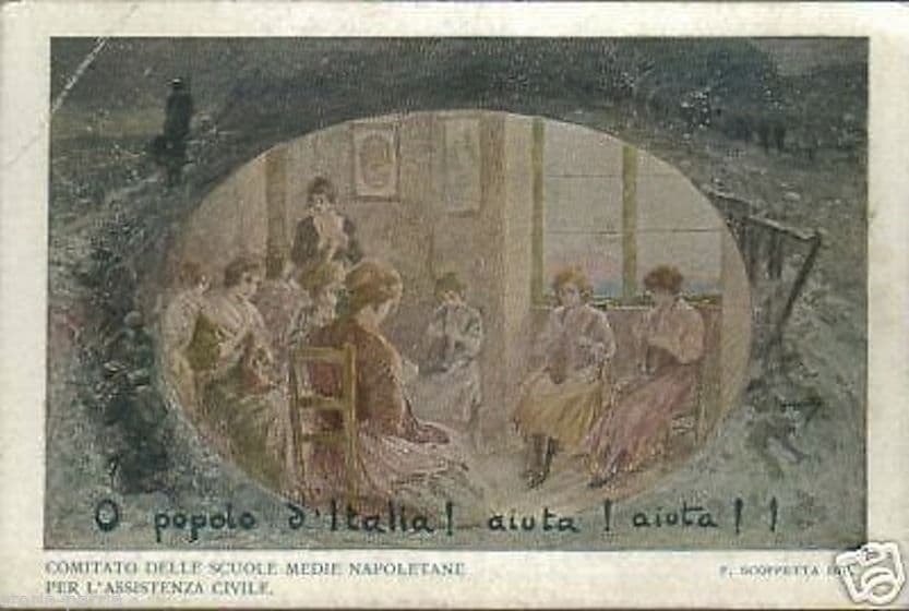 O popolo d'Italia! Aiuta! Aiuta!! ***Comitato delle Scuole Medie Napoletane per l'Assistenza Civile*** **Cartolina originale d'epoca, cm. 9x14 circa, non viaggiata; ediz. Alfieri e Lacroix (Milano)** **Con bella illustrazione del celebre pittore napoletano** **P. Scoppetta** Di interesse collezionistico per le varie tematiche collegate Buona conservazione generale, difetti d'uso e d'epoca, piegatura ad un angolo.