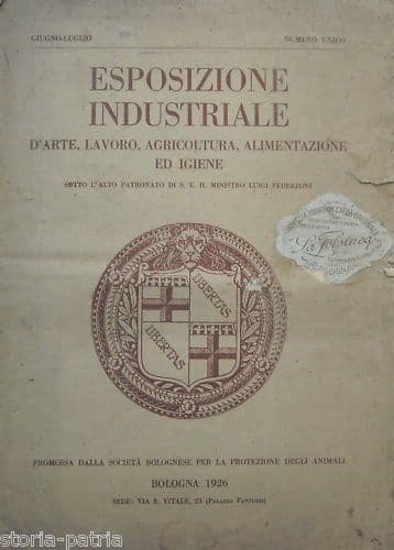 Esposizione Industriale *D'arte, lavoro, agricoltura, alimentazione ed igiene* *....* **Bologna, 1926** Cm. 34x24; pp. 18; bross. edit. (sciupata) Interessante edizione originale antica e d'epoca, "numero unico" del giugno-luglio 1926, diretto da Raul Jandra, dedicato alla Esposizione bolognese, promossa dalla "Società Bolognese per la protezione degli animali" sotto l'alto patronato del ministro Pederzoni, il cui ritratto in divisa fascista è illustrato alle prime pagine della pubblicazione; copertina anteriore arricchita da una illustrazione simbolica araldica, con scudo con iscritta Libertas, e anche la testa di un leone, probabilmente simbologia araldica collegabile alla municipalità di Bologna, sede della Esposizione; elencati i nomi dei numerosissimi membri del comitato d'onore e promotore e esecutivo; segue una pagina intera di presentazione della Esposizione, *segue poi la cronaca della inaugurazione;* *una intera pagina è dedicata alla visita di Guglielmo Marconi, del quale è anche presente un ritratto fotografico;* *segue la rassegna dei vari stands, con evidenziate alcune manifatture esposte, tra cui quelle della* *Cesarini (pellicceria), Ulisse D'Amico (Calzaturificio Mercanzia), Isoi di Gino Monti (farmaceutica);* *Ansaloni-Malagoli-Gallini (pellicceria); Federico Haas (attrezzature per fabbricare scarpe);* *Belvederi (macchine da cucire)* *Giuseppe Lolli (biciclette, con la bicicletta Savoia)* *Pederzoli (sandalificio)* *Maestrani (calzature per alpinisti e cacciatori)* *Gestetner (duplicatore)* *Luigi Zamboni (macchine per pastifici, per fabbricazione di tortellini e pasta fresca)* *Pompeo Toniutti (ebanisteria)* *Ettore Bongiovanni (vaporizzatore della Nafta per motori a scoppio)* *Luigi Scanabissi (lampade e lampadari)* *Zurla (mobili in ferro)* *Tartari (disinfettanti a pompa)* *Ballanti e Bignami (chiave meccanica in acciaio forgiato)* *Pietro Collina (industria della riproduzione di disegni; articoli di cartoleria e cancelleria)* *Ramaso Vittor (di Saliano Micca, cappelleria; offrì a Marconi un cappello del tipo coloniale, molto apprezzato)* *Maglificio Italiano* *Anonima Ceraria Costetti (candele)* *Frediano Menziani (stufe)* *Cia (prodotti essiccati)* *Enea Villani (motori per motocicli)* *Vini di Romagna* *Sarti (burro)* *Lorenzo Lotti (biscottificio)* *Atti-Bassi (confetture)* *Vico Girardini (liquirizia, La Felsinea,...)* *Barabino e Graeve (di Genova, stampe e litografie)* *Agostino Marchesini (giocattoli)* *Cognac Diana (liquori)* *Tolomelli (termosifoni a nafta)* *Sammartin (biscottificio)* *Filicori (caffè)* *Barattini (frigoriferi)* *Negrini (dolciaria, confetti)* *Albergo Diurno* *con anche alcune inserzioni pubblicitarie, come quelle dei magazzini garages Luigi Errani di Bologna per automobilismo (con veduta del magazzino in cui si notano ruote e ricambi di vario tipo); Antica Sartoria Bisi; Associazione Nazionale Ferrovieri; La Felsinea (adesivo pubblicitario incollato sulla copertina anteriore); Gomme Hutchinson; Giuseppe Camera (studio fotografico); Credito Romagnolo; Stabilimenti Poligrafici Riuniti (Bologna); Federazione Casse Rurali;* *e sulla copetina posteriore, apiena pagina, la pubblicità delle Lampade Edison (con raffigurata al centro una lampadina Edison)* *[https://img80.imageshack.us/img80/4528/esposizione67c.jpg](https://img80.imageshack.us/img80/4528/esposizione67c.jpg) [https://img515.imageshack.us/img515/4538/esposizione67l.jpg](https://img515.imageshack.us/img515/4538/esposizione67l.jpg) * [https://img826.imageshack.us/img826/7366/esposizione67g.jpg](https://img826.imageshack.us/img826/7366/esposizione67g.jpg) Di interesse storico-locale, economico, specialistico, bibliografico Modesta conservazione generale, segni e difetti d'uso e d'epoca, piegature e sgualciture diffuse, fioriture e gore varie, stappi e difetti vari marginali con anche piccole perdite di testo, esemplare molto vissuto e con tracce di polvere e abrasioni; brossura molto consunta e con rotture al dorso e ai margini, margini indeboliti e in parte sfaldati; ma esemplare ben leggibile e di interesse specialistico per le varie tematiche collegate, utile documentazione d'epoca della produzione industriale locale romagnola, produzione dolciaria e sartoriale e meccanica o artistica; meritevole di eventuale restauro o almeno di una rilegatura. *(le immagini allegate raffigurano particolari dell'intera pubblicazione, eventuali altre informazioni a richiesta)*