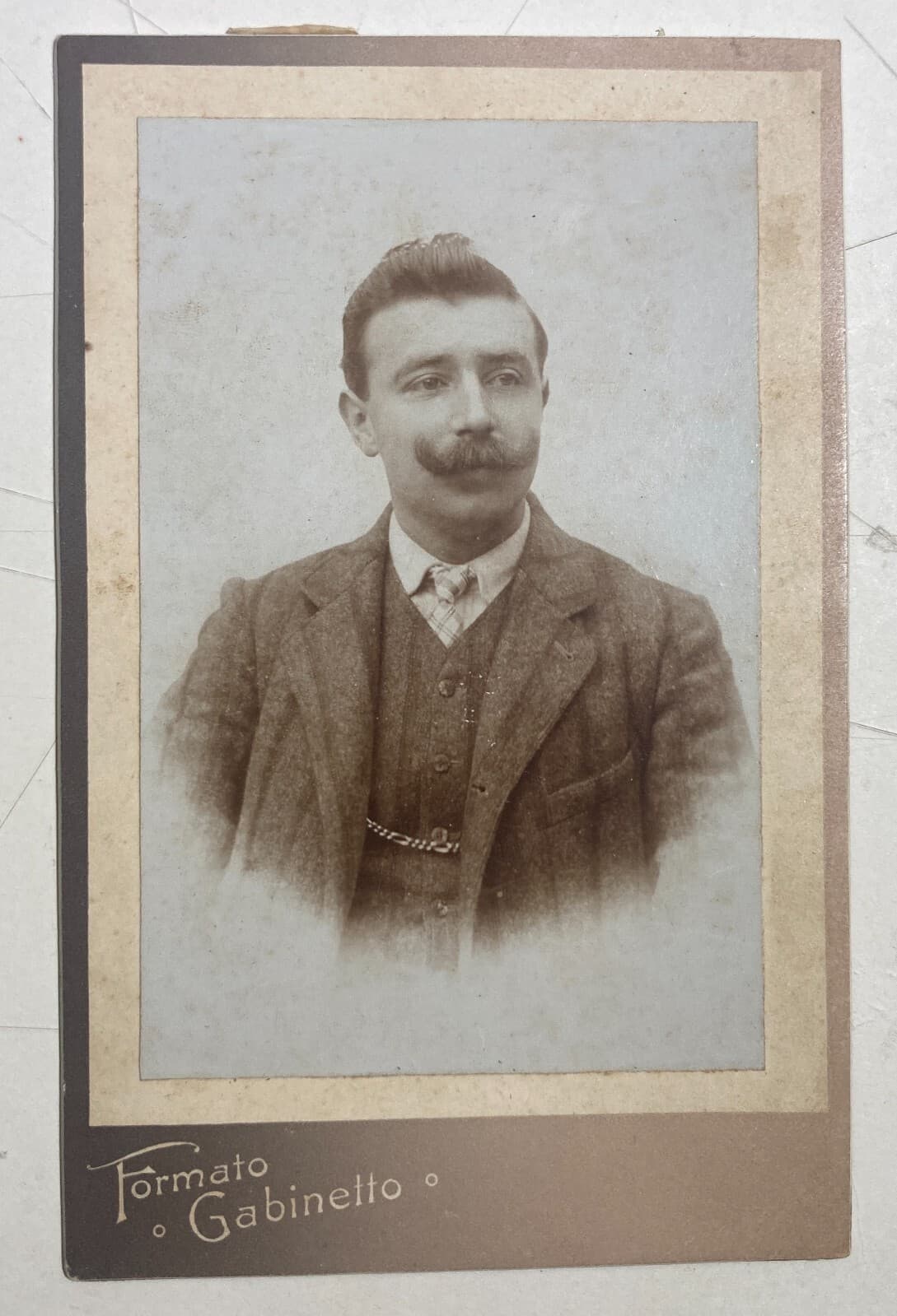 (Foto di famiglia) Interessante antica e rara fotografia originale, raffigurante un gruppo familiare, probabilmente una madre con due suoi bimbi, una in piedi su una sedia. Immagine molto suggestiva e di grande qualità artistica fotografica, ascrivibile a fotografo di **area russa**, la cui pubblicità figurata è impressa al verso del cartoncino di supporto, ma il suo nome è anche impresso a caratteri dorati marginalmente in basso al recto della foto. * **Fotografo**: Non identificato. * **Misure**: Circa cm 16x11 (cartoncino intero). * **Epoca**: Fine XIX - inizio XX secolo. Di interesse fotografico, araldico, pubblicitario e storico. Discreta conservazione generale, con segni d'uso e d'epoca, sparse fioriture, bruniture e abrasioni marginali. Esemplare adatto ad essere incorniciato.