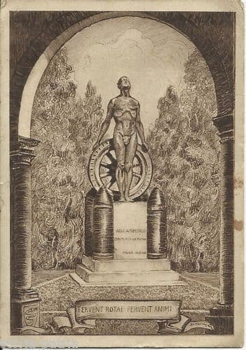 ** 3° Centro Automobilistico *"Fervent Rotae Fervent Animi"* Interessante edizione antica e d'epoca, bella veduta prospettica e architettonica relativa ad un monumento scultoreo a soggetto allegorico-militare, con una figura maschile virile in posizione eretta che tiene dietro le gambe una ruota di auto, il tutto su basamento ai cui angoli sono raffiguranti quattro grandi proiettili forse di cannone; al centro della lapide frontale è incisa la scritta *"Agli automobilisti caduti per la patria - maggio 1935"* stemma araldico in basso a sinistra, raffigurante uno scudo con all'interno un serpente; *bella illustrazione impressa su cartolina, eseguita e firmata dall'artista P. Menin (?);* *cartolina originale antica e d'epoca, misura circa cm. 10,5x15; edizioni Buzzetti (Milano); esemplare viaggiato per posta e ancora con l'antica affrancatura, datata 1935.* Di interesse collezionistico, specialistico, militare, artistico, automobilistico, decorativo Discreta conservazione generale, segni e difetti d'uso e d'epoca, diffuse fioriture, piegature o sgualciture e difetti vari marginali; **meritevole anche di essere inserita sotto passpartout ed incorniciata.** **