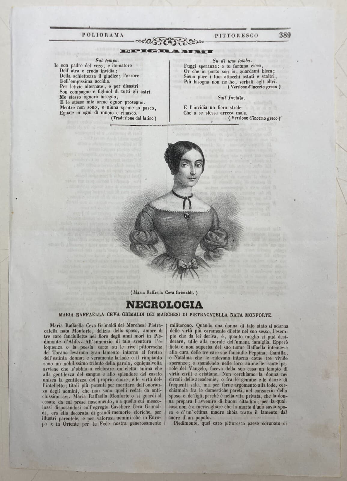 Interessante stampa litografica d'epoca raffigurante il ritratto della nobildonna **Maria Raffaella Ceva Grimaldi**, dei Marchesi di *Pietracatella* (nata Monforte). L'opera fu pubblicata originariamente a corredo di una necrologia apparsa su un periodico napoletano della metà del XIX secolo. L'esemplare conserva il foglio originario con il testo tipografico al recto e al verso, così come estratto dalla pubblicazione coeva. * **Soggetto:** Maria Raffaella Ceva Grimaldi. * **Tecnica:** Litografia originale. * **Epoca:** Circa 1847 (metà XIX secolo). * **Dimensioni:** Foglio intero circa 30x20,5 cm; area figurata circa 9x8 cm. * **Provenienza:** Napoli, editoria periodica. Esemplare di notevole interesse storico-locale per l'area del *Molise* e per studi genealogici sulla nobiltà del Regno delle Due Sicilie. La stampa si presta ad essere inserita sotto passe-partout e incorniciata. **Condizioni:** Discreta conservazione generale; sono presenti segni d'uso e del tempo, fioriture diffuse, bruniture e lievi sgualciture marginali come da documentazione fotografica.