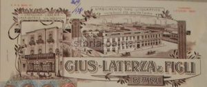 Documento d'epoca del 1928 su carta intestata pubblicitaria della celebre casa editrice e tipografia barese. L'intestazione presenta due raffinate illustrazioni litografiche: la libreria di via Sparano a Bari e lo stabilimento tipografico situato tra via De Rossi e via Candia.