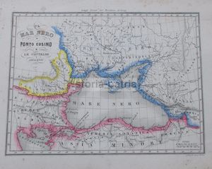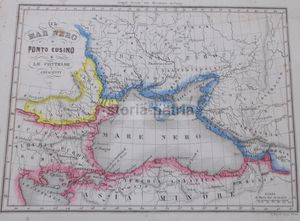 Incisione cartografica della metà del XIX secolo, raffigurante le regioni asiatiche e i territori limitrofi. La mappa include dettagli geografici di Valachia, Bulgaria, Turchia (europea ed asiatica), Mar di Marmara, Costantinopoli, Romelia, Crimea, Russia europea, Georgia, Armenia, Mare di Azoff, Caucaso, Astracan, Budapest e Simferopoli.