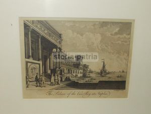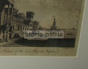 Interessante edizione antica d'epoca, raffigurante una veduta panoramica dell'area portuale napoletana con una prospettiva del palazzo vicereale. L'opera si distingue per la rappresentazione della sontuosa architettura, completa di colonnato e scalinata, identificata dalla didascalia originale in lingua inglese.