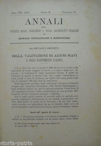 Annali della Società degli Ingegneri e degli Architetti Italiani **31 agosto 1893; Anno VIII, fasc. IV** Roma, Centenari, 1893 Cm.27, pagg. (da pag.221a pag.308); senza legatura. Interessante edizione originale antica e d'epoca, pubblicazione periodica, specialistica di ingegneria, architettura, edilizia, e altre attività affini tecnico scientifiche, *organo della Società degli Ingegneri, e pertanto ricca di tutte le informazioni necessarie al miglior svolgimento della professione;* in questa specifica pubblicazione troviamo scritti relativi ai seguenti studi: *Della valutazione di alcuni scavi e degli esaurimenti di acqua (Simonetti)* *I sifoni e le condizioni per il loro continuo funzionamento (Fossa Mancini)* *I ponti in acciaio sul fiume Taro nella ferrovia Parma-Spezia (Moreschi)* *Note e proposte sul progetto di legge ...per gli infortuni sul lavoro (De Vincentiis)* *Difesa fluviale dell'Alta e Media Italia (Cadolini)* *Sulle servitù di pascolo della Provincia romana (Franceschi): riferimenti ad alcuni toponimi della provincia romana rientranti nelle agenzie di Velletri e Viterbo, con citati tra altri Bagnaia, Canepina, Civitella Cesi, S. Giovanni di Bieda, Vetralla,...* *...* Opera di interesse tecnico scientifico specialistico ingegneristico architettonico storico-locale bibliografico Modesta conservazione generale, segni e difetti d'uso e d'epoca, diffuse fioriture, piegature sgualciture e strappetti vari alla copertina anteriore, difetti vari marginali, non presente la copertina posteriore, esemplare slegato e parzialmente sciolto; potrebbe anche essere andata dispersa una o più pagine finali, ma l'ultimo scritto pubblicato -così come si evince dall'incice in copertina anteriore- appare essere abbastanza completo, poichè esso termina con ben tre pagine di "conclusioni"; per tali motivi e non potendo confrontare con altri esemplari simili la pubblicazione viene offerta così com'è e come su descritta senza alcuna garanzia di integrità (ma crediamo con buona probabilità che sia completa!). *(le immagini allegate raffigurano particolari dell'intero oggetto, eventuali ulteriori informazioni a richiesta)*