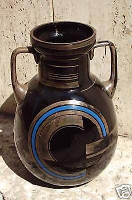 Artistico raro antico vaso Soprammobile in vetro scuro (nero?), con bella elegante decorazione a colori e in argento, su entrambi i lati, di bell'effetto estetico, design di gusto futurista, forse ascrivibile ad artista con simpatie verso il futurismo, forse Thayaht o altro. Belle grandi utili dimensioni, misura cm.31 circa (altezza), cm. 22 circa (ampiezza massimo); databile anni '30 (?) Oggetto molto bello e decorativo, artistico e da collezione Bella conservazione generale, segni o difetti d'uso e d'epoca, usuali inevitabili segni di usura alla decorazione e in particolare alla laminazione argentea.