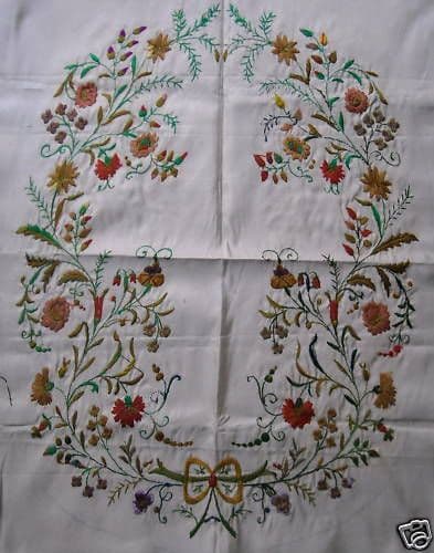 Bellissimo antico ricamo Rara ed artistica realizzazione artigianale, ricca lavorazione a fili colorati con effetto decorativo molto suggestivo, e con bellissima ghirlanda di fiori, probabilmente eseguito per poi poter essere incorniciato, e per anche accogliere al centro una scritta o una immagine sacra o forse meglio un Crocifisso d'argento così come era antica usanza nelle provincie meridionali italiane; *esemplare completato ma mai incorniciato, con ancora visibile il disegno dell'ovale, così come previsto dall'antica ricamatrice pugliese (garganica).* Misura cm. 51x39 circa (dimensioni del tessuto di supporto, forse in seta ?); ricamo visibile sia al recto che al verso della tela; databile primo '900.  Decorativo artistico e da collezione Buona conservazione generale, segni e difetti d'uso o d'epoca, varie piegature per essere stato sempre conservato ripiegato, alcune fioriture, bordi del supporto non rifiniti e lasciati sfilacciati, piccole lesioni in alcuni punti e ledioni alla piegatura centrale, ma ricamo molto ben conservato e ancora con i suoi vivacissimi colori originari, molto fascinoso, meritevole di essere rinforzato con altro supporto, o di essere inserito sotto passpartout ed incorniciato; il tutto così come da immagini allegate, così come rinvenuto in una vecchia soffitta di famiglia. *(le immagini in asta raffigurano particolari dell'intero pannello, eventuali altre informazioni a richiesta)* [](https://img151.imageshack.us/i/ricamo.jpg/ "ImageShack - Image And Video Hosting") Uploaded with [ImageShack.us](https://imageshack.us/)