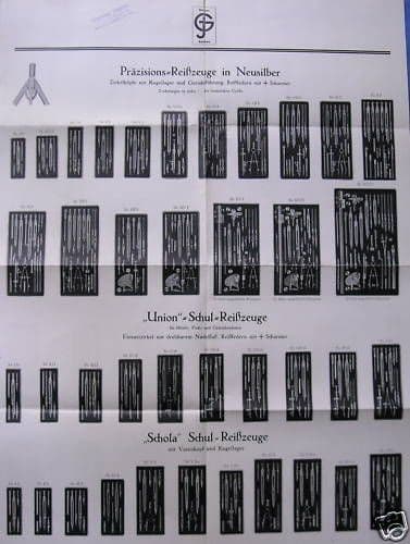 Ferruccio Torresan Milano Compassi J. Gronemann Vienna Interessante antico foglio volante, listino prezzi dei compassi prodotti dalla ditta austriaca Gronemann, compassi di precisione, tipo "Union", tipo "Scuola", cassette in legno, strumenti sciolti (tiralinee, balaustrino, compasso, porta-lapis, porta mine, ...);  *listino prezzi corredato di un grande foglio distinto, foglio di grandi dimensioni, tipo manifesto, illustrato su entrambi i lati, in cui sono raffigurati le numerose scatole di compassi (al recto) e al verso i pezzi singoli, ossia compassi singoli e altri strumenti tiralinee o portamine o ....*  Il tutto con molte figure illustrative! Il foglio con il listino prezzi misura cm. 30x44,5; mentre il grande foglio con le illustrazioni misura cm.63x47 (ed è stato stampato a Vienna, e le scritte sono in lingua originale austriaca); il tutto databile alla metà del '900, probabilmente anni '30 (?) Di interesse specialistico scientifico pubblicitario collezionistico Buona conservazione generale, segni e difetti d'uso e d'epoca, inevitabili piegature ad entrambi i fogli, il foglio grande presente una lunga rottura alla piegatura centrale superiore (eventualmente facilmente restaurabile, o da inserire sotto passpartout ed incorniciare); complessivamente si inviano due fogli distinti, uno con il listino (non illustrato) e l'altro -quello grande- con le illustrazione dei compassi e di altri attrezzi accessori.