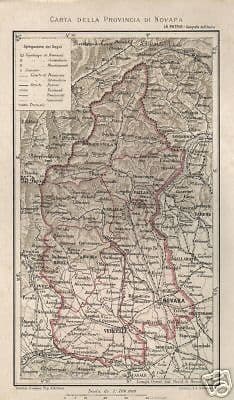 **Carta della Provincia di Novara** Innumerevoli toponimi relativi a piccoli paesi e grandi città, tra cio Domodossola, Locarno, Biella, Ivrea, Crescentino, Casale, Abbiategrasso, Gallarate, Varallo, .... Dettagliata mappa topografica, con la distribuzione viaria locale e la conformazione geofica dei territori. Stampata presumibilmente negli ultimi anni dell'800, dalla Lit. Salussolia, Torino, per un opera geografica o storica locale. Decorativa e da collezione Dimensione cm. 28x19 circa (intero foglio, a margini bianchi diseguali); buona conservazione generale, segni e difetti d'uso e d'epoca, difetti marginali, difetti al verso.