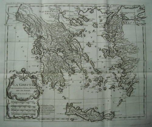 ## ## La Grecia .... Formata dal sig. D'Anville geografo Interessante antica mappa geografica dell'antica Grecia, con ben visibili anche le numerose isole circostanti, oltre alle regioni confinanti della Macedonia e la Tessalia,... con riportati gli innumerevoli antichi toponimi corrispondenti a località greche oggi probabilmente in parte non più esistenti o ridenominati, e tra essi evidenziamo *Apollonia, Epiro, Cefalonia, Leucadia, Zacinto, Itaca, Citera, Argolide, Eubea, Olinto, Tessalonica, Emazia, Pelagonia, Lenno, Panormo, Samotracia, Imbros, Ellesponto, Schiro, Andro, Delo, Nasso, Melo, Anafe, Lero, Doride, Carpato, Creta, Gaulo, Rodi, Patmos, Smirne, Lesbo, Tebe, Pergamo, ...* *e in alto a sinistra è anche visibile la parte estrema meridionale dell'Italia, il promontorio salentino, o Japigia, con la località di Otranto.* Mappa geografica originale antica, in origine tavola illustrativa di un'opera probabilmente storica della fine del '700; cartografia eseguita dal noto geografo D'Anville; incisione originale all'acquaforte, di belle grandi dimensioni, misura cm. 30,5x37 circa (dimensioni della battuta o impronta della lastra di stampa, esclusi i larghi margini bianchi irregolari e rifilati diseguali. Bel cartiglio artistico in basso a sinistra, con inscritti il titolo e la scala della mappa Di interesse storico-artistico, cartografico, storico-locale, collezionistico e decorativo Buona conservazione generale, segni e difetti d'uso e d'epoca, sparse fioriture, difetti e sgualciture e strappetti marginali, numerose inevitabili piegature; su bella carta vergellata, **meritevole di essere inserita sotto passpartout ed incorniciata.** *(le immagini allegate raffigurano alcuni particolari dell'intero foglio)*