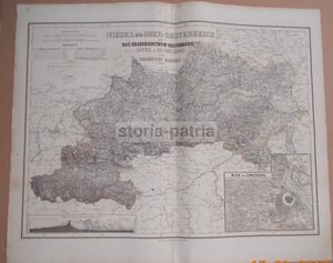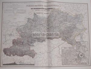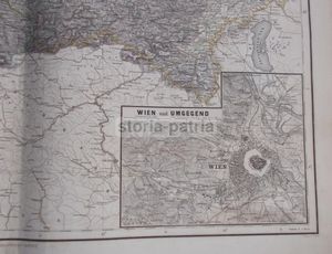 Grande mappa geografica originale della seconda metà dell'Ottocento, incisa da W. Kratz per il Weimar Geographisches Institut. L'opera raffigura dettagliatamente l'Austria e i territori confinanti, arricchita da due riquadri specialistici: