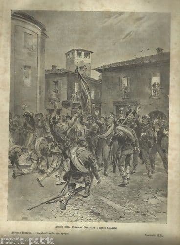*Arrivo della colonna garibaldi a Sesto Calende* Interessante antica veduta, raffigurante un episodio legato agli avvenimenti risorgimentali italiani, in particolare connesso alla epopea garibaldina, con illustrato l'animata accoglienza offerta dalla cittadina di Sesto Calende, con numerosi militari dei quali uno sventolante una grossa bandiera; stampa antica, di belle dimensioni, misura circa cm.30x22 (l'intero foglio, compresi i margini bianchi diseguali); foglio originariamente edito quale tavola illustrativa fuori testo (verso bianco) di una pubblicazione storico risorgimentale del primo '900. Di interesse storico, risorgimentale, storico-locale, militare, collezionistico Buona conservazione generale, segni e difetti d'uso e d'epoca, diffuse fioriture, difetti vari e sgualciture marginali, **meritevole di essere inserita sotto passpartout ed incorniciata.** *(l'immagine allegata raffigura un particolare dell'intero foglio, eventuali ulteriori infromazioni a richiesta)*