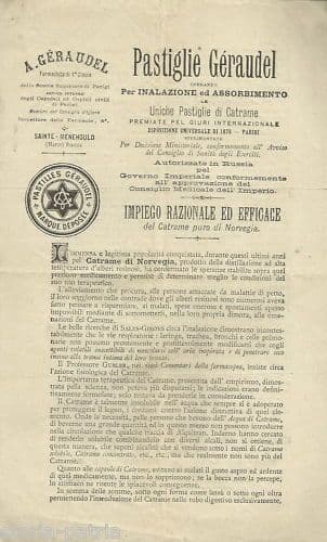 Pastiglie Geraudel *Uniche pastiglie al catrame* *....* Interessante antica e rara pubblicitaria, foglio volante impresso su entrambi i lati, con pubblicizzate le pastiglie al catrame del noto farmacista francese (di Sainte-Menehould), ed elogiate quale uniche pastiglie al catrame puro di Norvegia, prodotto per distillazione ad alta temperatura di alberi resinosi,... *con elogiate le sue virtù curative, l'azione sull'apparato bronco polmonare o respiratorio, utili a fumatori, e anche all'apparato digerente e genito-urinario,...;* foglio di circa cm. 22x13; impresso su entrambi i lati; esemplare databile all'inizio del '900. Di interesse specialistico farmaceutico, medico, collezionistico Buona conservazione generale, segni e difetti d'uso e d'epoca, piegature e sgualciture, difetti vari o strappetti marginali, **meritevole anche di essere inserito sotto passpartout ed incorniciato.**