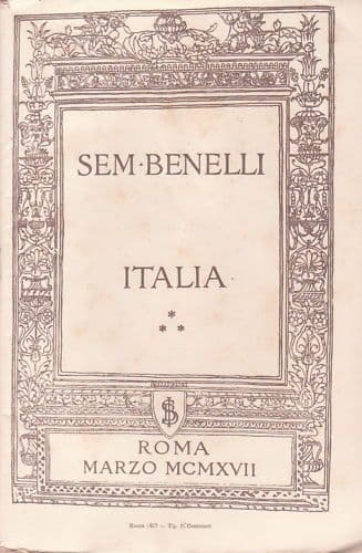 Sem Benelli Italia *Orazione detta la sera del 13 marzo del 1917 al Teatro Adriano in Roma* (Roma ?), Banca Italiana di Sconto, 1917 Cm.24, pp. 37, bross. edit. figurata (difetti) Interessante edizione originale antica e d'epoca, dissertazione tenuta dal noto "*poeta-soldato"* Sem Benelli, su invito della Banca di Sconto, a fini propagandistici, per la raccolta di fondi necessario a sostenere le contingenti diffilcotà legate alla situazione politica italiana e bellica, *e pertanto il tema del discorso è proprio l'Italia, e in essa l'autore esprime le proprie impressioni ed esperienze, tra Alpi e Appennini, Immortalità, Roma, la civiltà romana, le invasioni barbariche, il poverello d'Assisi, il Rinascimento, l'arte, l'arte toscana, Botticelli, Aretino, Leonardo, Garibaldi (il ligure condottiero), Carducci, ....* *bella elegante edizione, su buona carta a larghi margini, e con la copertina anteriore arricchita da una cornice decorativa e allegorica.* Di interesse storico culturale bibliografico Buona conservazione generale, segni e difetti d'uso e d'epoca, diffuse fioriture, difetti vari marginali, copertina posteriore con erosione marginale ad un angolo esterno con minimo interessamento anche alle due carte contigue, ma complessivamente edizione di pregio e da collezione.