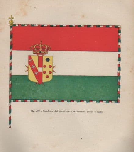 Bandiera del Granducato di Toscana *(dopo il 1848)* Interessante vecchia stampa raffigurante la bella bandiera, con la sua ricca simbologia allegorica, con uno scudo raffigurante insegne nobiliari nella parte centrale del tricolore, il tutto contornato da un fregio fatto di piccoli Tricolori, come pure la stessa asta. Misura circa cm. 24x17 (l'intero foglio, compresi i margini bianchi irregolari e diseguali); stampa antica, in origine tavola illustrativa di un'opera di interesse storico-militare del primo '900 (anni '30 ?). Di interesse specialistico, storico-militare, araldico, collezionistico Buona conservazione generale, segni e difetti d'uso e d'epoca, sparse fioriture, difetti vari marginali, ***meritevole di essere inserita sotto passpartout ed incorniciata***. *(l'immagine allegata raffigura un particolare dell'intero foglio)*