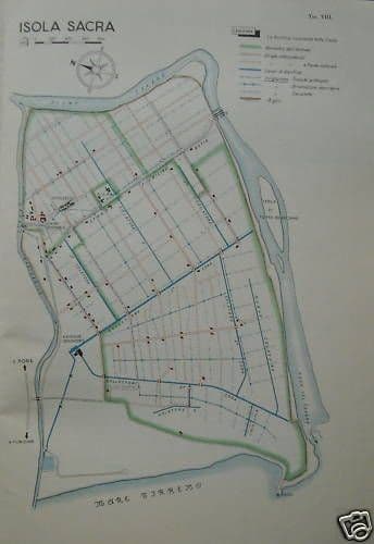 Isola Sacra Interessante mappa topografica relativa a quel territorio situato tra la foce del Tevere e il Mar Tirreno, nei pressi di Ostia e Porto, ampia pianura sottoposta alle opere di bonifica idraulica, *con evidenziate le opere rientranti nel piano di bonifica, che comprese tutta l'Isola, e con visibili il limite dell'azienda, strade interpoderali, strade a fondo naturale, canali canalizzazioni argini ...,* con anche riportati i toponimi di Faro, Fiumicino, Ostia, Sepolcreto, Fiume Tevere, l'edificio idrovoro, Silpa, ponte la Scafa,.... Misura cm. 30,5x21,5 circa (l'intero foglio, compresi i margini diseguali); stampa a colori originale d'epoca, in origine probabilmente tavola illustrativa f.t. di una pubblicazione specialistica sulle bonifiche fasciste, edita verso la metà del '900. Di interesse specialistico tecnico idraulico, ingegneristico, storico-locale, topografico, collezionistico Buona conservazione generale, usuali segni e difetti d'uso e d'epoca, **meritevole di essere inserita sotto passpartout ed incorniciata.**