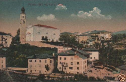 Fondo Val di Non Bellissima antica veduta a colori panoramica della bella località del Trentino, con visibile la grande chiesa e numerose abitazioni, e in primo piano probabilmente la stazione ferroviaria poiché sembrano essere binari quelli che si intravedono in basso nell'immagine. Misura cm.14x9 circa; non viaggiata; databile primo '900; ben conservata. Di interesse storico-locale fotografico collezionistico