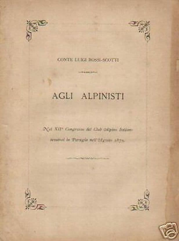 Conte Luigi Rossi Scotti Agli alpinisti Perugia, Santucci, 1879 Cm.20, pp.6, bross. edit. (difetti) Interessante edizione antica e d'epoca, componimento edito in occasione del *XII Congresso del Club Alpino Italiano tenutosi in Perugia nell'agosto 1879.* Di interesse specialistico, storico-locale, bibliografico Buona conservazione generale, difetti d'uso o d'epoca, gore marginali.