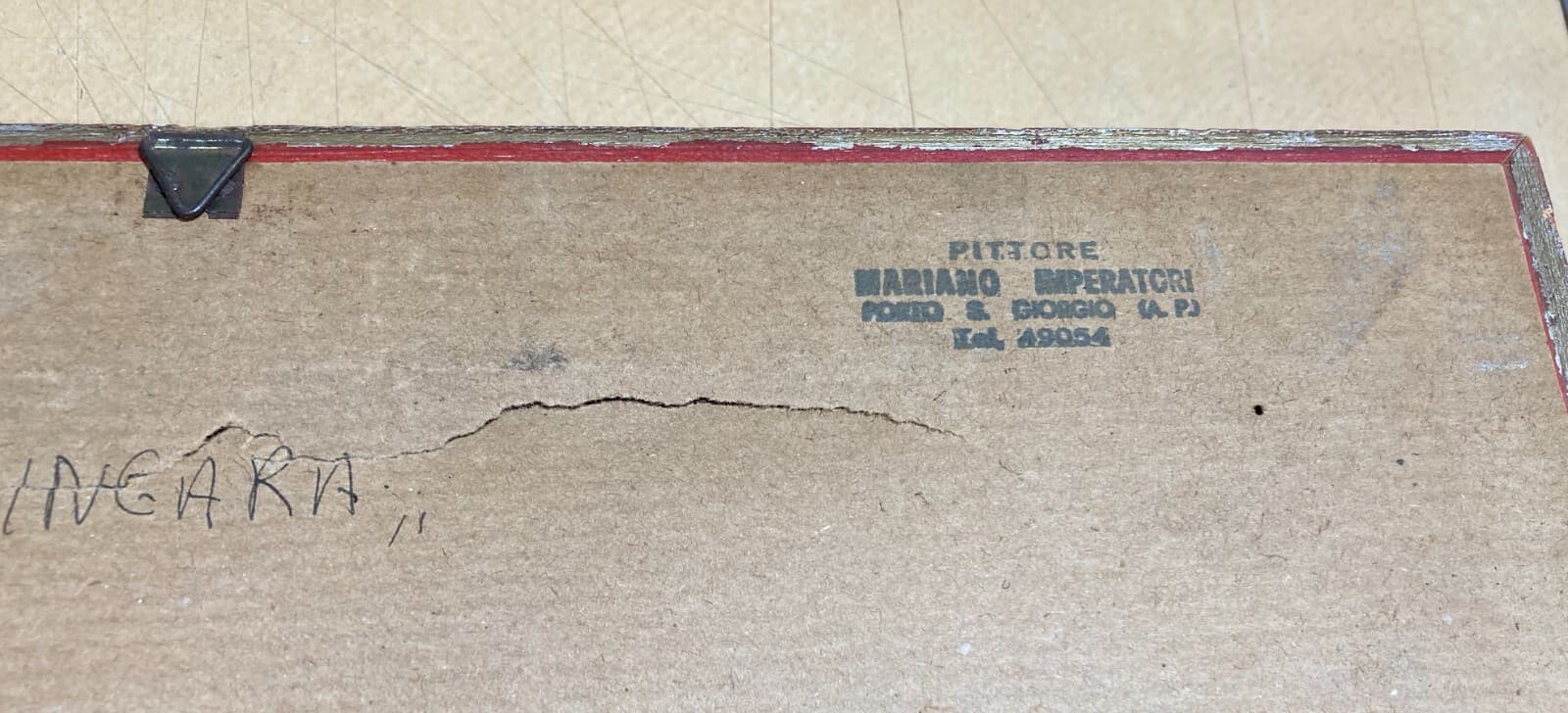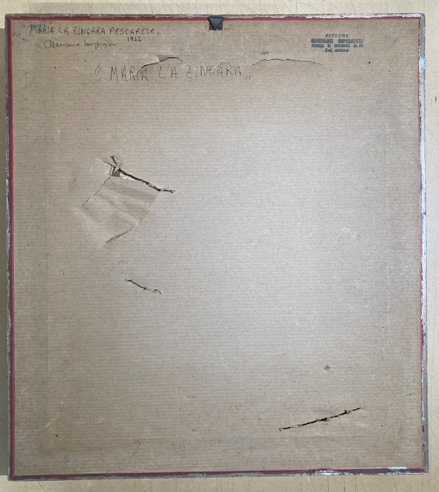 Suggestiva opera d'arte del pittore marchigiano **Mariano Imperatori** (Porto San Giorgio, 1921-1979), raffigurante "Maria la zingara pescarese". Il dipinto ritrae in primo piano una figura nomade storicamente vissuta a *Pescara*, in Abruzzo. * **Autore:** Mariano Imperatori. * **Tecnica:** Olio su cartone (o tela cartonata). * **Dimensioni:** 21x18 cm circa (opera), 43x38,5 cm (con cornice). * **Datazione:** 1977. * **Cornice:** Legno sagomato e argentato con passepartout e vetro protettivo. L'opera è firmata in basso a destra e sul retro della cornice. Si presenta in discrete condizioni generali con naturali segni del tempo, conservata sotto vetro.