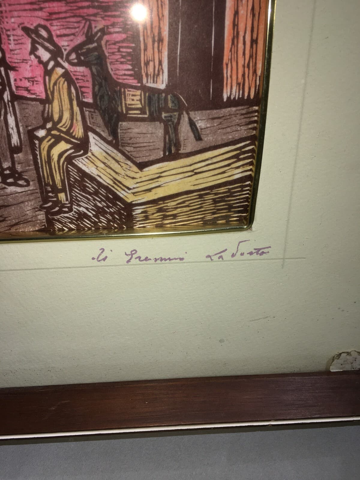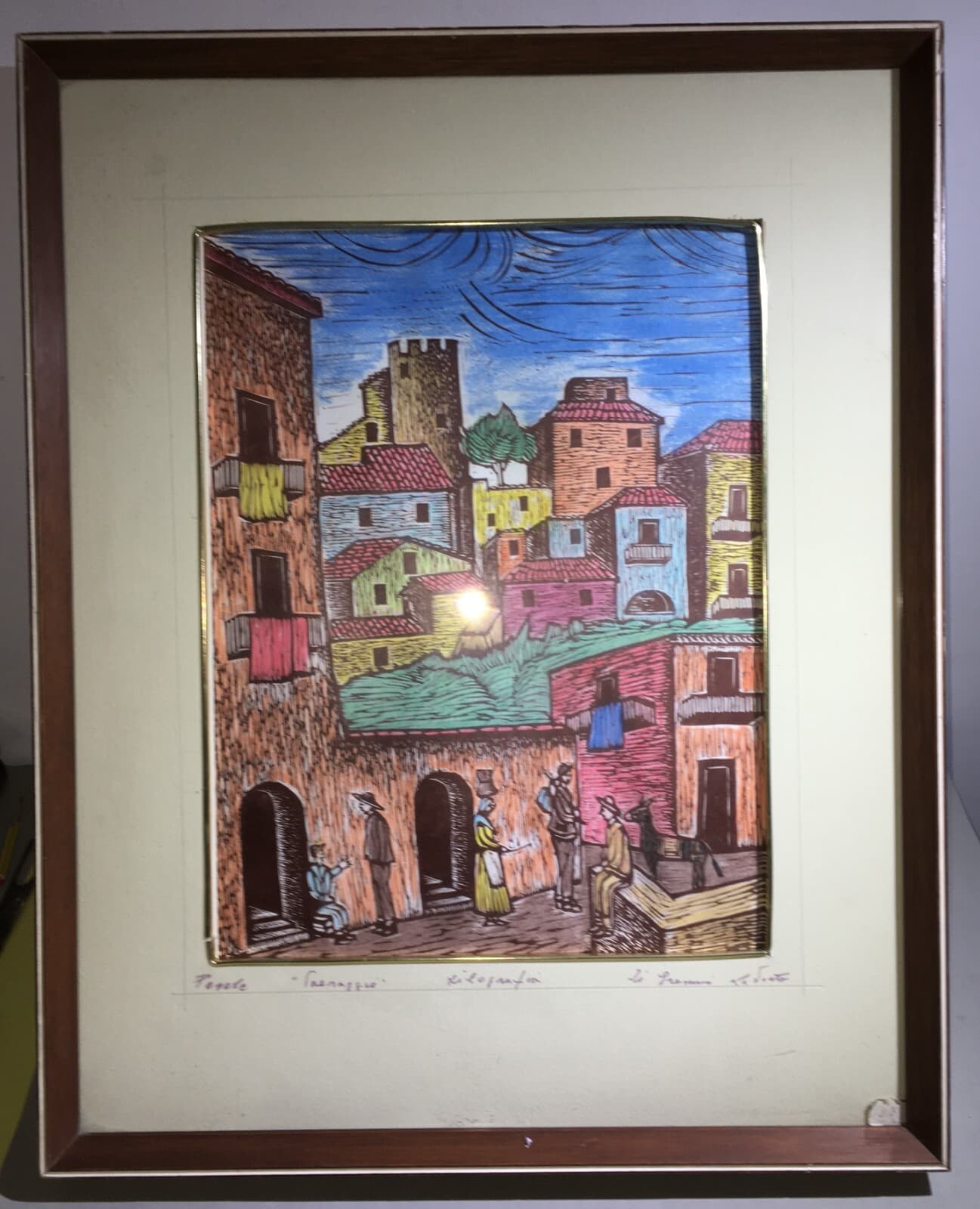 Interessante opera d'arte raffigurante una veduta folkloristica di **Pesche**, in provincia di *Isernia* (*Molise*). La scena cattura l'architettura locale con una torre merlata e figure animate, tra cui una donna che trasporta una conca d'acqua sulla testa, secondo l'antica usanza rurale della zona. * **Tecnica**: xilografia a colori su carta. * **Dimensioni**: veduta di circa 43x32 cm (esclusi i margini). * **Autore**: firmata in basso a destra **Erasmo La Porta** (?). * **Epoca**: seconda metà del Novecento (circa anni '60-'70). * **Conservazione**: discreta, con segni d'uso e del tempo; include cornice originale in legno e passpartout.