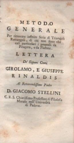 Girolamo e Giuseppe Rinaldis Metodo generale *per ritrovare infinite serie di triangoli rettangoli, di cui non sono che casi particolari i proposti da Pitagora, e da Platone* *Lettera* *dei signori conti* *Girolamo, e Giuseppe Rinaldis* *al reverendissimo padre* *D. Giacomo Stellini* *C.R.S. chiarissimo professore di filosofia morale nell'Università di Padova* S.i.t., s.d.(Venezia, metà '700) Cm.14,5; pp. (da pag.337 a pag.354); senza legatura. Interessante edizione originale antica e d'epoca, rarissimo saggio, di argomento scientifico matematico, in cui gli autori dissertano di tematica che spazia tra scienze matematica-geometrica e filosofia, il tutto ovviamente di impossibile sintesi per la specialistica trattazione, con anche riferimenti all'Abate Suzzi, del quale gli autori si definiscono allievi. Di interesse storico matematico, collezionistico, bibliografico *rarissima, nessun esemplare noto nel sistema bibliotecario nazionale.* Buona conservazione generale, segni e difetti d'uso e d'epoca, sparse fioriture, opera slegata e parzialmente sciolta, senza legatura o copertine (edizione apparsa in una raccolta miscellanea di scritti vari settecenteschi) e pertanto meritevole di rilegatura.