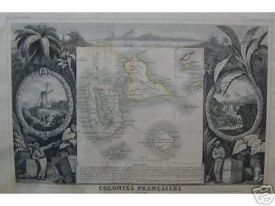 Interessante inusuale antica e scenografica cartografia delle colonie francesi comprendente l'isola della Guadalupe e le numerose altre isole del suo arcipelago. Opera del cartografo **V. Levasseur** Con scritte di Burty Incisione originale antica e d'epoca stampata a Parigi (da A. Combette ?) verso la metà dell'800. **Misura cm. 35x49 circa (l'intero foglio, compresi i margini bianchi diseguali)** *Opera caratterizzata da ampia scenografia (probabilmente dell'artista R. Bonheur) simbolizzante il tipico paesaggio locale, con indigeni ed esploratori, e con le indicazioni della principale produzione commerciale locale (zucchero, cotone,…);* *bella la vignetta incisa a sinistra con un mulino a vento, circoscritta da una corona di lauro in cui sono due ritratti di uomini illustri;* *mentre molto interessante è la vignetta incisa sulla destra, dove si osserva un paesaggio con case cadenti e persone che fuggono forse in conseguenza di un evento di terremoto.* *Utile la scheda didascalica presente in basso, dove sono alcune note storiche e statistiche.* Di interesse storico geografico turistico collezionistico Discreta conservazione generale, segni e difetti d'uso e d'epoca, sparse fioriture e ampie gore, difetti vari marginali, meritevole di essere inserita sotto passpartout ed incorniciata.