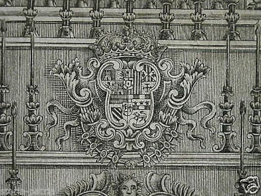 Bellissima antica raffigurazione *relativa ad un sontuoso altare o tabernacolo,* *sovrastato da cuscini su cui poggia una corona (insegna reale o principesca?), e sui vari gradini numerosi candelieri accesi e altri grandi candelieri tenuti in mano da angioletti seduti alle estremità dei vari gradini,* *mentre verso la base notiamo un grande scudo sormontato da una faccina allegorica, e su questo scudo -al centro della scena- una ricca allegoria araldica, un blasone con varie ripartizioni -significative probabilmente delle varie parentele nobiliari- sormontato da una corona forse principesca o reale, e tutta l'insegna araldica è circoscritta in basso da un collare pure esso di stretto significato araldico, pertinente probabilmente ad un ordine cavalleresco di cui doveva essere stato insignito il nobile personaggio committente dell'altarolo, o al quale venne dedicata l'opera d'arte;* incisione originale antica e d'epoca, eseguita all'acquaforte (ossia stampa su carta da una matrice in rame), databile tra XVII-XVIII sec., ***unico frammento superstite*** di quella che inizialmente doveva essere una veduta integrale del simulacro; misura circa cm. 18x11,5 (intero frammento, compresi i piccoli margini diseguali superstiti su due lati); *pur essendo un frammento dell'originaria incisione, comunque esemplare interessante e utile per collezionisti e studiosi di araldica* *(è ipotizzabile che le insegne nobiliari raffigurate si possano riferire ad un Reale Borbone napoletano)*  Di interesse artistico, araldico, culturale, collezionistico Modesta conservazione generale, segni e difetti d'uso o d'epoca, sparse fioriture, difetti e rotture marginali, vecchie annotazioni al verso; esemplare su carta vergellata, meritevole di eventuale restauro o almeno **meritevole di essere inserito sotto passpartout ed incorniciato.** *(le immagini allegate raffigurano alcuni particolari dell'intero foglio, eventuali ulteriori informazioni a richiesta)*