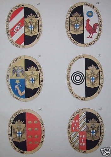 Sei antichi stemmi araldici Bellissime raffigurazioni a colori di sei antiche casate nobiliari meridionali, impresse su unico foglio e raffiguranti gli emblemi di ceppi nobiliari imparentati con i Filangieri di Napoli: *Filippo Ravaschieri Fieschi, principe di Satriano - Teresa Filangieri* *Giovan Francesco Filangieri - Giovanna Galluccio, duchessa di Tora* *Ottavio Costa, marchese di Arielli - Caterina Filangieri* *Filippo dell'Abbadessa, duca di Tora - Ippolita Filangieri* *Carlo Filangieri, principe di Satriano - Agata Moncada* *Giovanni Guevara Suardo, duca di Bovino - Carolina Filangieri* Stemmi impressi in litografia a colori, con anche dorature, in medaglioni ovali affiancati su unico foglio; ogni medaglione misura cm. 9x7 circa, su foglio di cm. 40x30 circa; databile alla metà dell'800; impressi in Napoli presso la celebre stamperia-litografia Gatti & Dura. Di interesse artistico, araldico, storico-locale, collezionistico e decorativo Bella conservazione generale, usuali segni o difetti d'uso e d'epoca, **meritevole di essere inserita sotto passpartout ed incorniciata.** *(le immagini allegate raffigurano un particolare dell'intero foglio)*