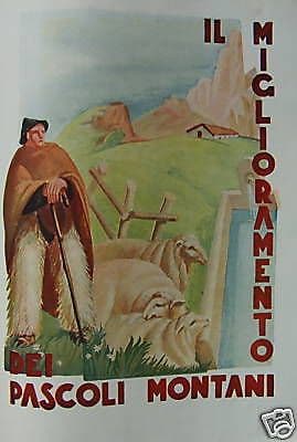 Milizia Forestale Il miglioramento dei pascoli montani **Interessante antica e rara stampa,** **pubblicitaria, bella grafica raffigurante una sintesi del patrimonio montano e della pastorizia sottoposto alla gestione e conservazione da parte della Milizia Forestale.** **Di interesse artistico e collezionistico** Misura cm. 31x21,5 circa (intero foglio), senza data (ma stampa illustrativa tratta da una pubblicazione del 1935); buona conservazione generale, segni o difetti d'uso e d'epoca; stampa al recto, verso bianco; degna di essere inserita sotto passpartout ed incornciata.