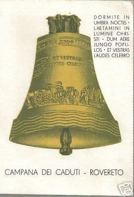 **Campana dei Caduti** Rovereto *Bella cartolina originale d'epoca, raffigurante la nota campana la cui descrizione al verso indica anche le dimensioni e "...per ricordare i caduti in guerra..."* *grande formato, circa cm.10x15, non viaggiata; ediz. Crespi (Vigevano), s.d. (circa anni '40 ?)* Di interesse collezionistico per le varie tematiche collegate (arte, storia devozionale, militaria, storia locale,...) Buona conservazione generale, segni d'uso o d'epoca.