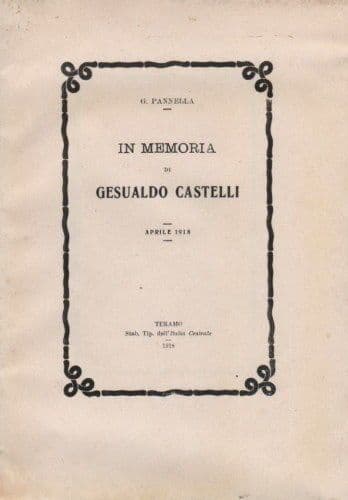G. Pannella In memoria di Gesualdo Castelli Aprile 1918 Teramo, Tip. dell'Italia Centrale, 1918 Cm. 25, pp. 16, bross. edit. Interessante edizione originale antica e d'epoca, con all'interno una epigrafe e un discorso necrologici relativi alla morte di un cittadino teramano, Gesualdo Castelli. Di interesse culturale, storico-locale e bibliografico *rara edizione originale, **nessun esemplare noto** nel sistema bibliotecario nazionale* Buona conservazione generale, segni e difetti d'uso e d'epoca, sparse fioriture, usuali sgualciture o difetti marginali, edizione con tutte le pagine incorniciate con un motivo decorativo in nero.