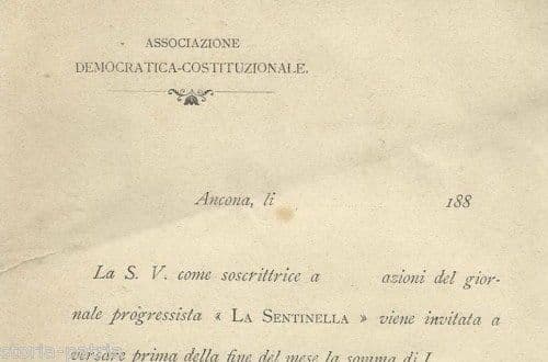 Associazione Democratica-Costituzionale Ancona *"La S. V. come sottoscrittrice...."* Interessante edizione antica e d'epoca, pieghevole mai utilizzato, ma che all'epoca veniva compilato a cura della "Commissione" e inviato ai soci del giornale locale progressista anconitano "*La Sentinella",* quale invito al pagamento di una quota trimestrale; la quota doveva essere versata ad Adriano Colocci (a Loreto), incaricato a tale funzione. Di interesse storico-locale marchigiano, politico, collezionistico Misura circa cm.21x13,5; databile alla seconda metà dell'800 (circa 1880); buona conservazione generale, segni e difetti d'uso e d'epoca, sparse fioriture, piegature o sgualciture marginali; unico foglio impresso alla sola prima pagina, foglio piegato in due (pertanto di complessive 4 pagine); **meritevole anche di essere inserito sotto passpartout ed incorniciato.** *(l'immagine allegata raffigura un particolare dell'intero foglio, ossia l'intestazione della prima pagina, eventuali ulteriori informazioni a richiesta)*