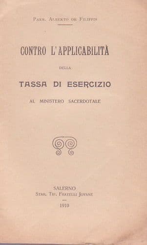 Alberto de Filippis Contro l'applicabilità della tassa di esercizio al ministero sacerdotale Salerno, Jovane, 1910 Cm.18, pp. 24, bross. edit.(difetti) Interessante antica edizione originale e d'epoca, dissertazione tenuta dal De Filippis (da Cava dei Tirreni) e indirizzata ai componenti della Giunta Provinciale di Salerno, quale portavoce dei reclami che sacerdoti e canonici e parroci elevarono contro l'applicazione di una onerosa tassa di esercizio stabilita di 4 lire annuali per i semplici sacerdoti, fino a 10 lire per canonici e parroci; *il relatore pertanto espone i motivi dell'opposizione, anche avvalendosi della giurisprudenza in materia, l'erronea interpretazione della amministrazione di Cava che pretende di equiparare il sacerdozio ad una qualsiasi professione civile,...con riferimenti ai beni e privilegi della Chiesa.* Di interesse specialistico, giuridico, storico-locale napoletano, bibliografico Buona conservazione generale, segni e difetti d'uso e d'epoca, sgualciture e difetti vari alle copertine.
