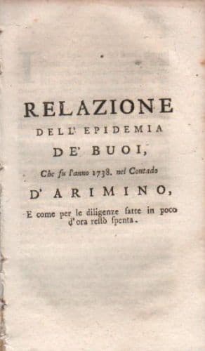 Anonimo Relazione dell'epidemia de' buoi che fu l'anno 1738 nel contado d'Arimino *e come per le diligenze fatte in poco d'ora restò spenta.* S.i.t., s.d. (Venezia, metà '700). Cm.14,5; pp. (da 331 a pag.350); senza legatura. Interessante antica e rara edizione d'epoca, saggio storico–medico-sanitario-veterinario relativo all'epidemia che vide coinvolte molte località della riviera adriatica, oltre a Rimini (Romagna) anche Fano e Pesaro (Marche), ma che si estese anche verso alcune località della Toscana, come Arezzo, e la cui origine venne individuata in un carico di bestiame proveniente dalla Croazia; *con anche descrizione dell'evolversi della malattia ed i provvedimenti di cure veterinarie che vennero approntati all'epoca al fine di arginare l'epidemia.* Di interesse storico-locale, scientifico specialistico medico-veterinario, bibliografico *rara pubblicazione d'epoca, edita in una raccolta di scritti settecenteschi, **nessun esemplare noto** nel sistema bibliotecario nazionale italiano.* Buona conservazione generale, segni e difetti d'uso e d'epoca, sparse fioriture, opera slegata e senza legatura o copertine e pertanto meritevole di rilegatura.