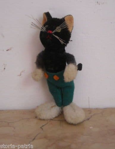 Bellissimo gattino *grazioso peluche, raffigurante un simpaticissimo gatto, di razza non ben definibile,* *micio con pelo nero e zampe bianco-grigio,* *con zampe eventualmente modellabili, orecchie rivestite all'interno di pannolenci, e in pannolenci anche il grazioso vestito-pantaloni verde con applicazioni colorate, lunghi baffi in pelo di setola (?), occhi vitrei,* *il tutto di grande effetto realistico, e molto decorativo, forse figura corrispondente ad un personaggio di antico fumetto!* graziose mini dimensioni, misura circa cm. 9 (altezza in posizione eretta); in tessuto peloso non ben definibile, forse lana, e in panno-lenci; nessun marchio di fabbrica apparentemente visibile, ma esemplare di grande qualità e probabilmente ascrivibile a una nota fabbrica di giocattoli della prima metà del '900. [https://img24.imageshack.us/img24/3971/gatto9b.jpg](https://img24.imageshack.us/img24/3971/gatto9b.jpg) [https://img846.imageshack.us/img846/417/gatto9e.jpg](https://img846.imageshack.us/img846/417/gatto9e.jpg) [https://img29.imageshack.us/img29/9614/gatto9f.jpg](https://img29.imageshack.us/img29/9614/gatto9f.jpg) [https://img21.imageshack.us/img21/4659/gatto9g.jpg](https://img21.imageshack.us/img21/4659/gatto9g.jpg) [https://img808.imageshack.us/img808/6627/gatto9l.jpg](https://img808.imageshack.us/img808/6627/gatto9l.jpg) [https://img801.imageshack.us/img801/7277/gatto9a.jpg](https://img801.imageshack.us/img801/7277/gatto9a.jpg) Decorativo e da collezione *per collezionisti di giochi e giocattoli d'epoca e di altre tematiche collegate; da vetrina!* Buona conservazione generale, segni e difetti d'uso o d'epoca, tracce di polvere o difetti vari marginali, probabilmente esemplare mai utilizzato. *(le immagini allegate raffigurano alcuni particolari dell'intero oggetto, eventuali ulteriori informazioni a richiesta)* [](https://img24.imageshack.us/i/gatto9b.jpg/) [](https://img846.imageshack.us/i/gatto9e.jpg/) [](https://img29.imageshack.us/i/gatto9f.jpg/) [](https://img21.imageshack.us/i/gatto9g.jpg/) [](https://img808.imageshack.us/i/gatto9l.jpg/) [](https://img801.imageshack.us/i/gatto9a.jpg/)