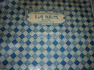 Interessante stampa pubblicitaria della ditta barese La Sem, specializzata in pasticceria e confetteria. Il documento è impresso su un foglio destinato all'incarto o all'imballaggio per confezioni di dolci.