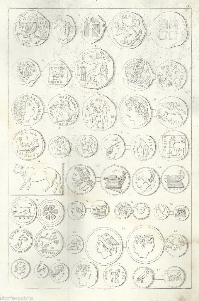*(Monete varie)* Interessante antica raffigurazione, con visibili numerose monete antiche, delle quali alcune viste recto-verso, monete di varie dimensioni, con illustrate simbologie e allegorie varie, tra esse una con la civetta, guerrieri, cavallo alato, barca a remi, animali vari, deità mitologiche (Ermes,...), ritratti,... incisione antica originale e d'epoca, in origine tavola illustrativa di un'opera storico o geografica o di viaggio della metà del XIX sec.; misura circa cm.20,5x13,5 (la sola parte figurata, esclusi i margini bianchi irregolari e rifilati diseguali), circa cm. 26,5x16,5 (l'intero foglio). Di interesse numismatico, artistico, iconografico, decorativo, collezionistico Modesta conservazione generale, segni e difetti d'uso e d'epoca, sparse fioriture, ampio alone o gora, con segni di vecchio umido e difetti vari marginali, **meritevole di essere inserita sotto passpartout ed incorniciata** *(l'immagine allegata raffigura un particolare dell'intero foglio, ossia la sola parte incisa, eventuali ulteriori informazioni a richiesta).*