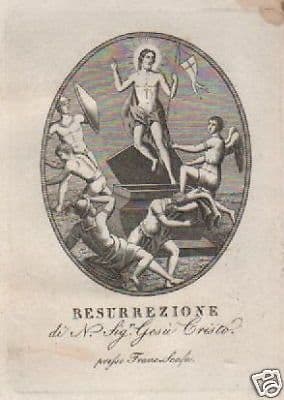 Resurrezione di N. Sig. Gesù Cristo Bella antica e originale raffigurazione sacra devozionale, con il Cristo che esce dal sepolcro e sale verso il cielo, aiutato da un angelo, tra lo stupore dei soldati romani ivi presenti. Genuina e artistica opera calcografica, impressa dal noto stampatore (artista incisiore litografo) napoletano **Francesco Scafa** **Incisione originale antica all'acquaforte,** misura cm.12,5x9 circa (l'intero foglio), cm. 10x7 circa (l'impronta della lastra); databile alla prima metà dell'800. Di interesse artistico devozionale e collezionistico Buona conservazione generale, segni e difetti d'uso e d'epoca, margini irregolari di cui uno rifilato al limite dell'impronta della lastra, sparse fioriture, gora ad un angolo, meritevole di essere inserita sotto passpartout ed incorniciata. *(l'immagine allegata è un particolare dell'intero foglio)* ######## *Ampia disponibilità di altre opere simili, con altri soggetti devozionali* *(ulteriori informazioni a richiesta)* $$$$$ Guarda le altre mie aste! \>>Tutte le mie offerte sono garantite originali e d'epoca<<