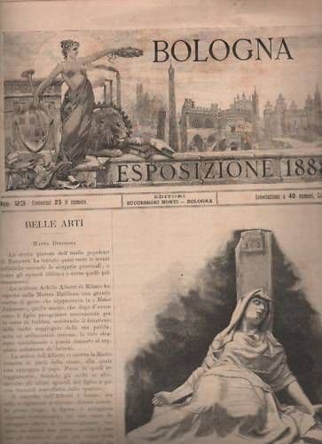 Bologna *Esposizione 1888* Bologna, Monti, 1888 Cm. 38x27, pp. (da pag. 177 a pag. 184), senza legatura. Interessante edizione originale antica e d'epoca, pubblicazione periodica ideata in concomitanza della nota manifestazione d'arte bolognese del 1888, della quale era anche una espressione della cronaca e degli avvenimenti, fascicolo per fascicolo venivano presentati artisti e opere d'arte, di pittura o scultura, o arti minori varie, ogni fascicolo con numerazione progressiva delle pagine, mediamente 8 pagine per fascicolo, usualmente anche illustrati. Ogni fascicolo inoltre è arricchito da una ampia ed artistica illustrazione della testata, una allegoria in cui sono raffigurati alcuni dei principali monumenti bolognesi o romagnoli o emiliani, ciminiere fumanti di industrie, una giovane fanciulla seminuda che regge una corona di alloro, uno stemma araldico, tavolozza e colori simbolo della pittura, strumento musicale simbolo della musica, compasso e martello, e altra simbologia tutta volta ad indicare le varie arti e la cultura, compresa la scultura e l'architettura, con anche un leone che sdraiato poggia una sua zampa su grossi libri,....illustrazione a firma G. Lolli (o Lotti ?), e incisa da Cantagalli (?). In questo unico fascicolo disponibile troviamo scritti e immagini relativi a: *Belle Arti: Mater Dolorosa: articolo e immagine sulla scultura in gesso dell'artista Achille Alberti (Milano);* *A colpo d'occhio: la mostra di belle arti (recensione di quanto osservato nei vari padiglioni, e annotazioni sull'arte lombarda, ligure, piemontese, napoletana e siciliana,...con citazioni di alcuni artisti e loro opere esposte;* *Il monumento a Vittorio Emanuele* *Giulio Monteverde* *La commemorazione dell'VIII centenario dello Studio bolognese nel cortile dell'Archiginnasio (grande illustrazione incisa a doppia pagina al centro del fascicolo, con innumerevoli persone presenti, animatissima e scenografica);* *I concerti sinfonici* *Parte ufficiale: VIII centenario dello Studio bolognese: rappresentanze italiane: accademie di Firenze, scuole, lauree d'onore, facoltà di Legge e Medicina, Atti del Comitato, ...* *Esposizione: giurie costituite (seguono molti nomi)* *Cronaca: notizie varie inerenti le varie manifestazioni bolognesi;* *La sala delle ceramica nel Palazzo dell'Industria: bella immagine incisa a piena pagina in fondo al fascicolo, con l'interno del padiglione che mostra scaffali ricchi di oggetti in ceramica, vasellame, opere d'arte, piatti e vasi artistici e figurati, soprammobili vari ceramici,....e le indicazioni pubblicitarie delle relative fabbriche (Ferniani, Melloni, ...)* *Tra le numerosissime citazioni presenti nelle recensioni notiamo i nomi di artisti come Faldi, Fattori, Cecconi, Gioli, Signorini, Tommasi, De Albertis, Bazzaro, Carcano, Spreafico, Bianchi, Giuliano, Formis, Calderini, Nono, Cirdi, Dall'Oca Bianca, Sorio, Zezzos, Zonaro, Nino Carnevali, Ademollo, Panerai, Segantini, Previati, Laccetti, Vighi, Piancastelli, Jerace, Busi, Serra, Monteverde, Faccioli, ...* Di interesse storico-locale, artistico, collezionistico, bibliografico *pubblicazione utilissima a collezionisti d'arte italiana dell'Ottocento, e ad appassionati e collezionisti di ceramica e maiolica italiana o emiliana romagnola.* Buona conservazione generale, usuali segni o difetti d'uso e d'epoca, sparse fioriture o sgualciture, esemplare a fogli sciolti, **le belle illustrazioni potrebbero anche essere inserite sotto passpartout ed incorniciate distintamente.** *(le immagini allegate raffigurano alcuni particolari dell'intera pubblicazione, eventuali altre informazioni a richiesta)*