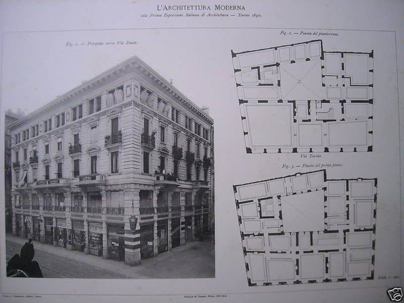L'architettura moderna Alla prima esposizione italiana di architettura Torino 1890 Casa Sartorelli *in via Torino, a Milano* *Antica e rara raffigurazione architettonica,* *con la bella veduta prospettica del maestoso palazzo, con visibili a piano terra le vetrine e le insegne di vari negozi commerciali, una lunga insegna per "fabbrica di fiori e piume" che forse era al primo piano, e poi un negozio di ombrelli con anche visibili alcuni esemplari nella vetrina, ....;* *alla raffigurazione fotografica che comprende la prospettiva su via Dante, è anche affiancata la pianta del pianterreno e la pianta del primo piano;* *progetto dell'architetto G.S. Locati, esposto alla nota rassegna specialistica di Torino.* Belle dimensioni, misura circa cm. 35x49 (dimensioni dell'intero foglio, compresi i margini bianchi); stampa antica e d'epoca, eseguita in fototipia da M. Bassani ("dal vero"), e impresse dagli editori torinesi Camilla e Bertolero, alla fine dell'800. Di interesse artistico storico-locale architettonico specialistico decorativo Buona conservazione generale, segni e difetti d'uso e d'epoca, sparse fioriture, sgualciture o difetti marginali; **meritevoli di essere inserite sotto passpartout ed incorniciate.** *(le immagini allegate raffigurano un particolare dell'intero foglio)* *########* *Della stessa serie sono pure disponibili i seguenti progetti, simili per dimensioni tecnica ed epoca:* *Casa Rigamonti, in via Solferino (Milano): arch. Locati* *Casa Bottelli, in via Dante (Milano): arch. Romeo Bottelli* *Casa Moretti, in via Dante (Milano): arch. Romeo Bottelli* *Casa Sartorelli, in via S. Raffaele (Milano): arch. Locati* *Nuove scuole elementari comunali, in via Galvani (Milano): arch. Camillo Boito (4 tavole!)* *Edicola funeraria per Carlo Pozzi, nel cimitero di Milano: arch. Locati* *Casa da pigione (Milano): arch. Bottelli* *Ricovero-modello del Pio Istituto di Maternità dei bambini lattanti e slattati (Milano): arch. Emilio Biganmi-Sormani* *Salone del Palazzo Municipale di Brescia: arch. Tagliaferri* *Nuovo altare maggiore della Chiesa di S. Francesco in Vigevano: arch. Gaetano Moretti* *Cimitero di Pavia: arch. Angelo Savoldi (2 tavole!)* *Scuola di Agricoltura "Giuseppe Pastori" (Orzivecchi, Brescia): ing. Luigi Morelli (3 tavole!)* *...........* *(eventuali altre informazioni a richiesta)*