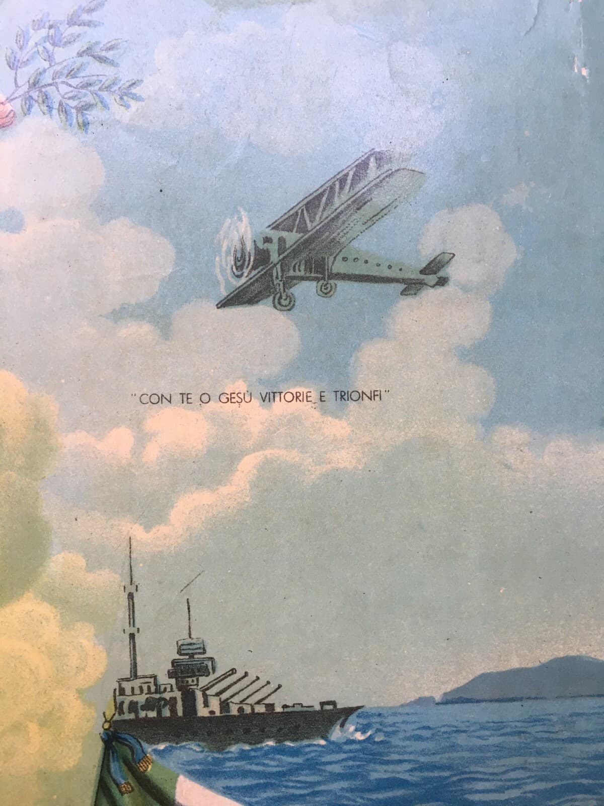**Madonna con bambino**. Interessante edizione d'epoca, illustrazione raffigurante una scena all'aperto con la Vergine Maria che offre cibo a colombe. L'opera è ispirata a un dipinto dell'artista **Maldarelli** (*Napoli*). * **Tecnica**: Stampa cromolitografica (oleografica) a colori su carta. * **Dimensioni**: Circa 36x77 cm (foglio intero privo di margini). * **Data**: 1934 (firmata in basso a destra). * **Stato di conservazione**: Discreta. Presenta segni d'uso e del tempo, fioriture diffuse, bruniture, pieghe, sgualciture e ampie gore marginali. Segni di arrotolatura del foglio.