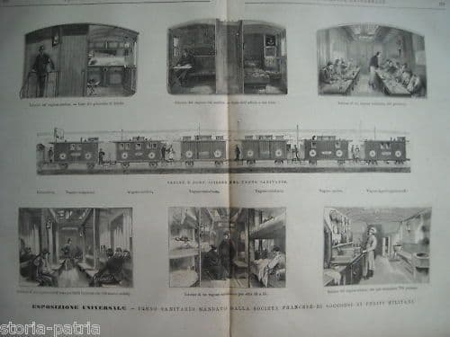 Treno sanitario *Mandato dalla Società Francese di Soccorsi ai Feriti Militari* *Antica e interessante raffigurazione dello spaccato di un treno sanitario, con l'esterno dei vagoni contrassegnati dal tipico simbolo della croce rossa, e vedute degli interni dei vari vagoni* *vagone medico con angolo ambulatorio* *vagone medico con lato ufficio e letto* *vagone refettorio con i tavoli e i commensali militari feriti* *vagone ambulanza per feriti leggeri (44 posti a sedere)* *altro vagone per feriti che devono stare distesi (circa 10-15 feriti)* *vagone cucina, con cuoco e cucina, utile per preparare pasti anche per 700 persone* *treno presentato alla Esposizione Universale di Vienna del 1873;* incisione xilografica antica e d'epoca, di belle grandi dimensioni, misura circa cm. 32,5x46 (l'intero foglio, aperto o disteso, compresi i margini bianchi diseguali); stampa edita in origine quale illustrazione di una pubblicazione periodica italiana della seconda metà dell'800 (1873); foglio originale, a doppia pagina, estratto dal periodico dell'epoca. Di interesse specialistico, sanitario, militare, decorativo, collezionistico Buona conservazione generale, segni o difetti d'uso e d'epoca, diffusa brunitura e sparse fioriture e difetti vari marginali, piegatura, foglio originale estratto dal periodico dell'800, illustrazione nel testo e pertanto con scritte impresse sia al recto che al verso del foglio, **stampa meritevole di essere inserita sotto passpartout ed incorniciata.** *(le immagini allegate raffigurano un particolare dell'intero foglio, ossia la sola parte figurata, eventuali ulteriori informazioni a richiesta)*