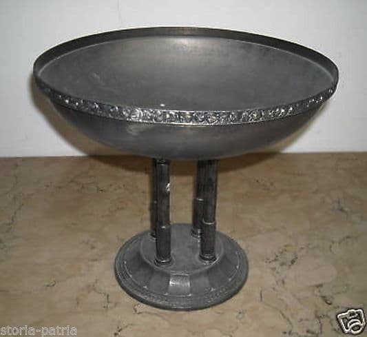 Decorativa alzata costituita da una base circolare su cui sono inserite quattro colonnine, che a loro volta poi sostengono un piatto concavo o bacile, all'interno del quale potevano essere collocate caramelle o cioccolatini, o altri prodotti dolciari da offrire agli ospiti, *ma buona anche come fruttiera o per altri usi.* *Artistico decoro e modellato della base, colonnine con scanalature, coppa superiore artisticamente ornata lungo il bordo con motivi floreali (rose?)* In metallo argentato (forse ottone argentato), misura circa cm.24 (altezza) x cm. 27 (diametro della coppa superiore, ossia dell'apertura); databile alla prima metà del '900.   Molto decorativa, da collezione, ovunque collocabile Buona conservazione generale, segni e difetti d'uso e d'epoca, usuale inevitabile ossidazione, così come dalle immagini allegate, così come rinvenuta in una vecchia soffitta di famiglia, ancora da pulire e lucidare al fine di far emergere la sua argentatura.