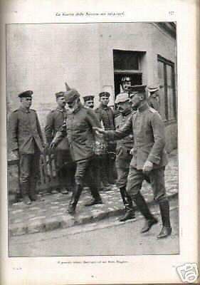 La guerra delle nazioni 1914-1918 Milano, Treves, 1920 Cm.28,5; pp.312; cartonato edit. (sciupato, slegato) Ampia e interessantissima cronaca degli avvenimenti che fecero la storia del primo novecento, ossia gli eventi bellici della prima guerra mondiale, con ampia trattazione -in questo unico quinto volume disponibile- sulla *Grande battaglia galiziana del 1915 e dall'avanzata tedesca fino a Wilna, all'arresto dell'offensiva russa di Brussilow nel 1916*  Arricchisce l'opera un ampio apparato illustrativo con ben 109 immagini fotografiche d'epoca, comprendenti ritratti, vedute e scene di guerra, eserciti e marine.....inglesi italiane polacche russe... Opera di interesse specialistico storico militare fotografico bibliografico Buona conservazione generale, segni e difetti d'uso o d'epoca, difetti o gore marginali, residui di adesione a qualche foglio a causa della patinatura della carta; opera slegata, pertanto volume meritevole di essere riassettato o di nuova rilegatura. ####### **Disponibili anche i voll. VI e VIII:** *Vol. VI: Dall'insuccesso tedesco nella Champagne e dalla drammatica lotta di Verdun fino al consolidamento francese e alla presa di Pozieres (pp. 304; 74 ill.)* *Vol. VIII: Dall'entrata in guerra dell'America alla rivoluzione russa (pp.320; 61 ill.)* *(ulteriori informazioni a richiesta)*