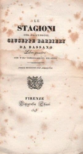 Giuseppe Barbieri da Bassano Le stagioni Firenze, Chiari, 1828. Cm.20, pp.210, senza legatura. Interessante edizione antica e d'epoca, bella raccolta di componimenti, presentati da Giacomo Bordiga, e dedicati a Maria Beatrice Principessa d'Este e Arciduchessa d'Austria, *poetica interpretazione delle fasi stagionali, a partire dalla Primavera, e a seguire la State (l'Estate), l'Autunno, l'Inverno: il tutto in quattro "libri",* *a cui seguono i* *"Componimenti relativi alle quattro stagioni",* *con elogi di piante e fiori, la festa del Majo, gli augelli, ...;* *chiude l'opera un Tributo di gratitudine ai Fiorentini, ed un Elenco di Associati della Toscana (lungo lenco di nomi di personaggi, tra cui molti di Lucca, Pisa, Pescia, Pistoia.* Di interesse culturale, letterario, storico-locale e bibliografico Discreta conservazione generale, segni e difetti d'uso e d'epoca, diffuse fioriture, ampie gore ad alcune carte iniziali; opera parzialemente slegata e a fogli sciolti, a fogli ancora intonsi, senza legatura o copertine e pertanto meritevole di rilegatura. *(l'immagine allegata raffigura un particolare del frontespizio)*