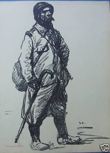 Interessante raffigurazione di un vecchio soldato, forse un reduce dalla guerra, con stivaloni e la sacca a tracolla, bastone in mano, elmetto in testa, suggestivo schizzo del noto artista Steinlen *uno dei protagonisti dell'arte europea tra '800 e '900* Antica incisione litografica, siglata a stampa su lastra in basso a destra "St." e anche con firma manoscritta estesa in basso a sinistra; misura cm. 37x28 (l'intero foglio, a margini bianchi diseguali), **Databile primo '900** Di interesse artistico e collezionistico Bella conservazione generale, usuali segni d'uso o d'epoca, meritevole di essere inserita sotto passpartout ed incorniciata, stampa al recto verso bianco. ######## *Théophile Alexandre Steinlein (**[Losanna](https://it.wikipedia.org/wiki/Losanna "Losanna"), [10 novembre](https://it.wikipedia.org/wiki/10_novembre "10 novembre") [1859](https://it.wikipedia.org/wiki/1859 "1859") – [Parigi](https://it.wikipedia.org/wiki/Parigi "Parigi"), [13 dicembre](https://it.wikipedia.org/wiki/13_dicembre "13 dicembre") [1923](https://it.wikipedia.org/wiki/1923 "1923")) è stato un [pittore](https://it.wikipedia.org/wiki/Pittore "Pittore") e [incisore](https://it.wikipedia.org/wiki/Incisione "Incisione") [svizzero](https://it.wikipedia.org/wiki/Svizzera "Svizzera"), conosciuto principalmente per le sue [litografie](https://it.wikipedia.org/wiki/Litografia "Litografia").* *Il suo nome dimostra le origini tedesche della famiglia paterna, anche se nacque nella* *[Svizzera](https://it.wikipedia.org/wiki/Svizzera "Svizzera") francese. Egli fu un artista appartenente all'[Art Nouveau](https://it.wikipedia.org/wiki/Art_Nouveau "Art Nouveau").* *Dopo aver raggiunto le classi superiori del Liceo, si iscrisse alla Facoltà di Lettere dell'Accademia di Losanna, ma ben presto dovette andare a lavorare presso un parente a* *[Mulhausen](https://it.wikipedia.org/wiki/Mulhausen "Mulhausen"), in una fabbrica di tessuti di lino ed il suo talento servì per i disegni decorativi dei tessuti.* *Nel* *[1881](https://it.wikipedia.org/wiki/1881 "1881") andò a Parigi, nel periodo in cui [Montmartre](https://it.wikipedia.org/wiki/Montmartre "Montmartre") raggiungeva il suo significato letterario ed artistico nel mondo. La sua prima affiche (manifesto) fu Trouville sur Mer del [1885](https://it.wikipedia.org/wiki/1885 "1885"). Nel [1891](https://it.wikipedia.org/wiki/1891 "1891") dipinse Le reve e scoprì la [litografia](https://it.wikipedia.org/wiki/Litografia_%28arte%29 "Litografia (arte)"). I quadri del [1894](https://it.wikipedia.org/wiki/1894 "1894"), anno in cui fece la sua prima esposizione a la Bodinière, mostrano la sua denuncia della miseria e della violenza (Le petit sou).* *Nel boulevard Rochechouart fu aperto il primo caffè artistico da Rodolphe Salis e, qualche anno dopo,* *[Le Chat Noir](https://it.wikipedia.org/wiki/Le_Chat_Noir "Le Chat Noir"), in rue Victor Masci. Salis amava definirsi "gentilhomme cabaretier", perché riteneva di avere la parentela con un'antica famiglia nobile svizzera ed il suo cabaret dette occasione a molti artisti e poeti di far conoscere le loro opere al pubblico. Fra questi artisti c'era Steinler che, a Le Chat Noir, conobbe anche [Toulouse Lautrec](https://it.wikipedia.org/wiki/Toulouse_Lautrec "Toulouse Lautrec"). Rodolphe Salis pensava prima di tutto al proprio interesse, perché ricompensava poco i suoi cantanti ed i suoi pittori, ai quali faceva pagare anche la birra che bevevano, senza tener conto che essi gli avevano riempito il locale di disegni e quadri. Egli aveva molte opere di Steinlen, fra le quali un quadro decorativo, rappresentante un concerto di gatti sui tetti di Montmartre: anche l'insegna "Le Chat Noir" (del [1896](https://it.wikipedia.org/wiki/1896 "1896")) affissa sulla porta del cabaret era stata dipinta da Steinlen.* *Nel* *[1900](https://it.wikipedia.org/wiki/1900 "1900"), per la sua conoscenza con [Emile Zola](https://it.wikipedia.org/wiki/Emile_Zola "Emile Zola") che aveva scritto L'assomoir, Steinlen dipinse un quadro a cui dette il titolo di questo libro.* *Poco dopo Steinlen cominciò a trattare i soggetti della vita popolare nelle sue illustrazioni dei canti di Bruants: lavoratori, mendicanti, musicisti, camelots, ortolani, cocottes, souteneurs, vita dei sobborghi, piazze, quartieri operai, perché nell'uomo egli riconobbe la vittima dell'ambiente sociale.* *Dal* *[1913](https://it.wikipedia.org/wiki/1913 "1913") al [1919](https://it.wikipedia.org/wiki/1919 "1919") produsse molte affiches di guerra, denunciando la miseria dei soldati e della gente (Deux mères et trois enfants - C'est la guerre).* *Collaborò con le sue illustrazioni al settimanale rivoluzionario Chambord, fondato da Gérault Richard, (1860-1911), deputato socialista e redattore della Petite Republique, firmandosi con lo pseudonimo Petit Pierre, traduzione leggermente modificata del suo cognome.* *Le sue illustrazioni lo fecero conoscere agli editori ed egli fece un contratto con l'editore del Gil Blas, anche se in questo giornale non poteva esprimere le sue idee rivoluzionarie, come faceva sullo Chambord.* *Le sue incisioni si ispirano alle stampe giapponesi.(dal web)*