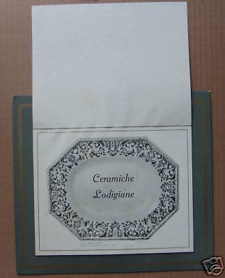 ** Adda S.p.A. *Officine Elettrotecniche e Meccaniche* *Manifattura Nazionale Isolanti Stampati* *Manifattura Nazionale Tele Metalliche* 1956 Interessante vecchio calendario, pubblicitario della nota azienda lodigiana, con raffigurazioni di alcune tipologie di ceramiche della prestigiosa manifattura di Lodi, per ognuna delle quali è indicata la fabbrica e la collocazione, *dalla fabbrica Rossetti-Tavazzi, alla Cappellotti, Ferretti, Dossena,* *in pratica un esemplare per ogni mese dell'anno;* misura circa cm. 19x23 (su base in cartone di circa cm. 26x29); Edizioni T.L. M. (Lodi)    Di interesse pubblicitario, storico-locale, collezionistico Buona conservazione generale, segni e difetti d'uso e d'epoca, abrasioni o strappi o spellature a qualche foglio a causa di vecchia adesione dei fogli dovuta alla carta patinata degli stessi. **