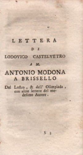 Lodovico Castelvetro Lettera di Lodovico Castelvetro *a M.* *Antonio Modona* *a Brissello* *del lustro, & dell'Olimpiada, con altre lettere del medesimo autore.* S.i.t., s.d.(Venezia, metà '700) Cm.14,5; pp. (da pag.413 a pag.432); senza legatura. Interessante edizione originale antica e d'epoca, raccolta epistolare di varia cultura, con riferimenti storici e mitologici, e citazioni varie tra cui Budeo, *Tiberio Scardua, Alciato, Antonio Costanzo da Fano, Paolo Maso, ...Ercole, Helide, Giove Olimpio, Asconio Pediano, Livio, console L. Emilio Paolo, Modena, Padova, Venezia, Bembo, Pontano, Viterbo, Petrarca, Laura, senesi e toscani, Sacrificio Intronatesco, Siena, M. Giulio Camillo, Croazia, ....* Di interesse storico-locale, letterario, bibliografico *rarissima edizione, nessun esemplare noto nel sistema bibliotecario nazionale.* Buona conservazione generale, segni e difetti d'uso e d'epoca, sparse fioriture, opera slegata e parzialmente sciolta, senza legatura o copertine (edizione apparsa in una raccolta miscellanea di scritti vari settecenteschi) e pertanto meritevole di rilegatura. cfr. [https://openlibrary.org/works/OL5600461W/Lettera\_di\_Lodovico\_Castelvetro\_a\_M.\_Antonio\_Modona\_a\_Brissello\_del\_lustro\_dell'Olimpiada\_con\_altre\_lettere\_del\_medesimo\_autore](https://openlibrary.org/works/OL5600461W/Lettera_di_Lodovico_Castelvetro_a_M._Antonio_Modona_a_Brissello_del_lustro_dell'Olimpiada_con_altre_lettere_del_medesimo_autore) [https://www.margini.unibas.ch/web/rivista/numero\_2/saggi/articolo3/castelvetro.html](https://www.margini.unibas.ch/web/rivista/numero_2/saggi/articolo3/castelvetro.html)