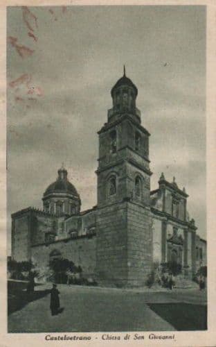 Castelvetrano *Chiesa di San Giovanni* *Interessante veduta del noto monumento cittadino,* *con anche alcuni cittadini o viandanti;* *cartolina originale d'epoca, piccolo formato, misura circa cm. 9x14, non viaggiata; databile anni '30; Ediz. Ciravolo (Castelvetrano)* Di interesse storico-locale, fotografico, collezionistico Modesta conservazione generale, difetti d'uso e d'epoca, difetti e macchie e gore di vecchio umido, in parte scollata, **meritevole anche di essere inserita sotto passpartout ed incorniciata.**